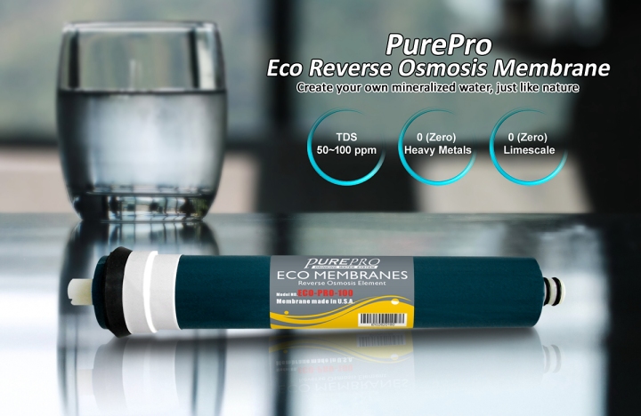 PurePro Eco RO membrane removes bacteria, viruses, heavy metals, viral contaminants, and other dangerous elements while still allowing valuable minerals to pass through, for your body to absorb. Drinking water should contain minimum levels of certain essential minerals. PurePro Eco RO membrane retains Calcium, Magnesium, Potassium and other natural minerals. PurePro is proud to introduce our newly designed residential Eco RO membrane elements # ECO-PRO-100.
