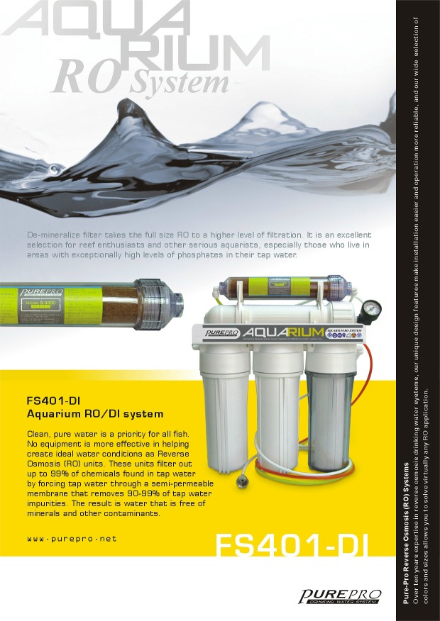 De-mineralize filter takes the full size RO to a higher level of filtration. It is an excellent selection for reef enthusiasts and other serious aquarists, especially those who live in areas with exceptionally high levels of phosphates in their tap water. Our unit includes: sediment pre-filters, carbon pre-filters and TFC (Thin Film Composite) membrane, Deionization (DI) post-filters in clear housings. The post deionizer takes the small percentage of contaminants that the membrane could not remove and filters this to greater than 99.99% pure. It will give you 0 ppm TDS, Conductivity attainable less than 0.1uS/cm or resistivity of close to 18 meg.ohm (click here for more information)