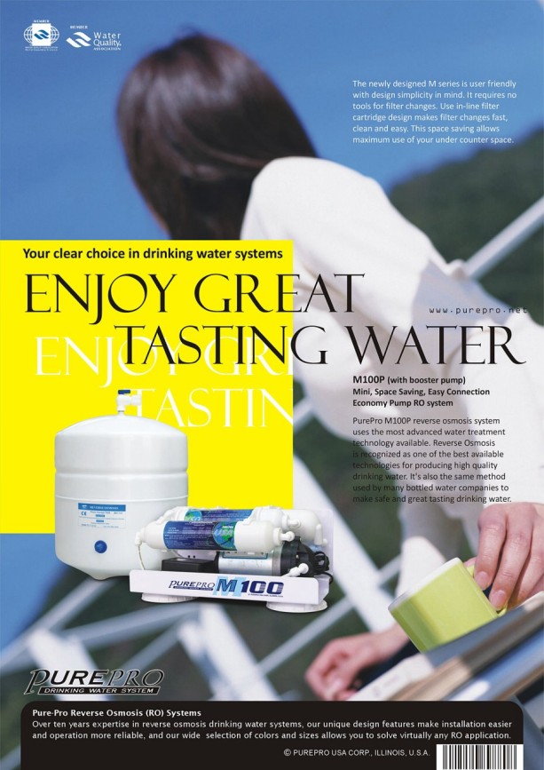 PurePro M100P reverse osmosis system uses the most advanced water treatment technology available. Reverse Osmosis is recognized as one of the best available technologies for producing high quality drinking water. It's also the same method used by many bottled water companies to make safe and great tasting drinking water.