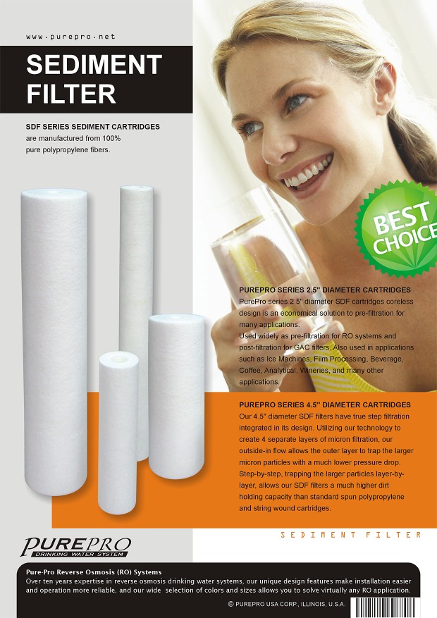 PurePro Pro Series 2.5" diameter SDF cartridges coreless design is an economical solution to pre-filtration for many applications. Used widely as pre-filtration for RO systems and post-filtration for GAC filters. Also used in applications such as Ice Machines, Film Processing, Beverage, Coffee, Analytical, Wineries, and many other applications.