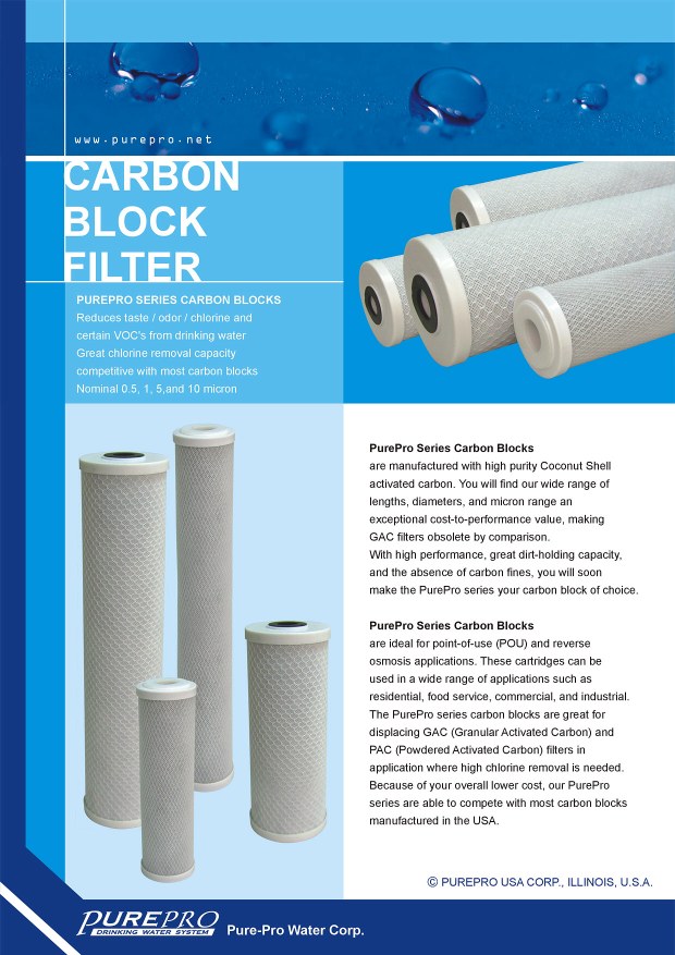 PurePro Series Carbon Blocks are ideal for point-of-use (POU) and reverse osmosis applications. These cartridges can be used in a wide range of applications such as residential, food service, commercial, and industrial. The PurePro series carbon blocks are great for displacing GAC (Granular Activated Carbon) filters in application where high chlorine removal is needed.