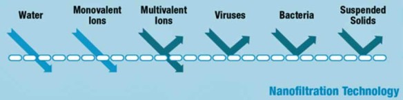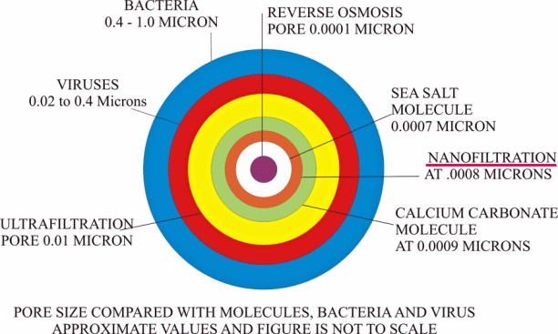 The Nanofiltration pore size diagram below will help you more understand the relative pore sizes of membranes and the sizes of the common impurities.
