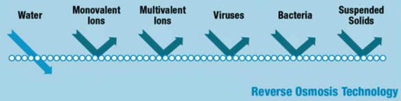 RO membrane only allows pure water to pass through. Everything else like monovalent and multivalent salts, bacteria and viruses are completely blocked.