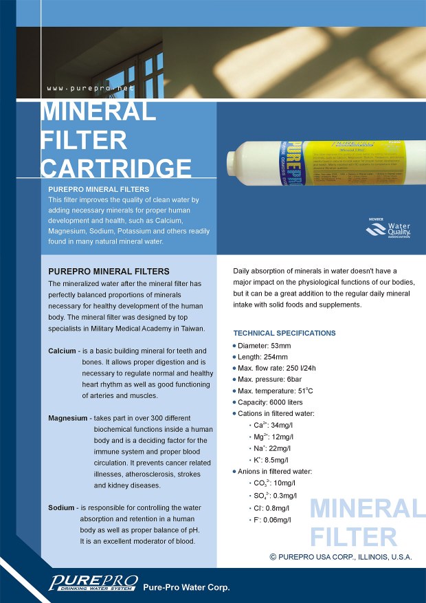 • This filter improves the qualities of clean water by adding necessary for proper human development and health minerals, such as Calcium, Magnesium, Sodium, Potassium and others readily found in many natural mineral waters.