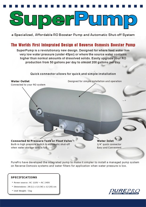 SuperPump is a revolutionary new design. Designed for where feed water has very low water pressure (under 45psi) or where the source water contains higher than normal amounts of dissolved solids. Easily upgrade your RO production from 50 gallons per day to almost 100 gallons per day.