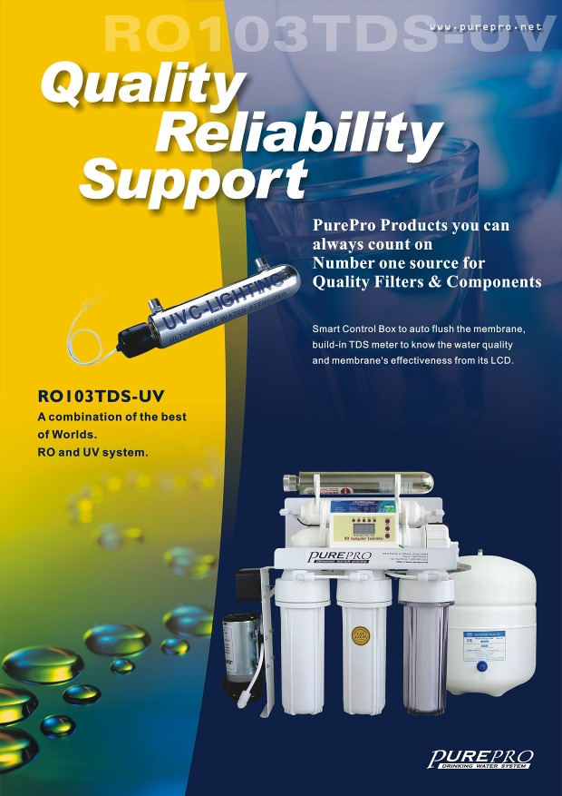 RO103TDS-UV system provides safe, pure water using Reverse Osmosis Technology. It is one of the finest units in its class. It uses no chemicals or electricity and provides premium water quality. It's capable of removing over 95% of total dissolved solids, +99% of all organics and +99% of all bacteria.