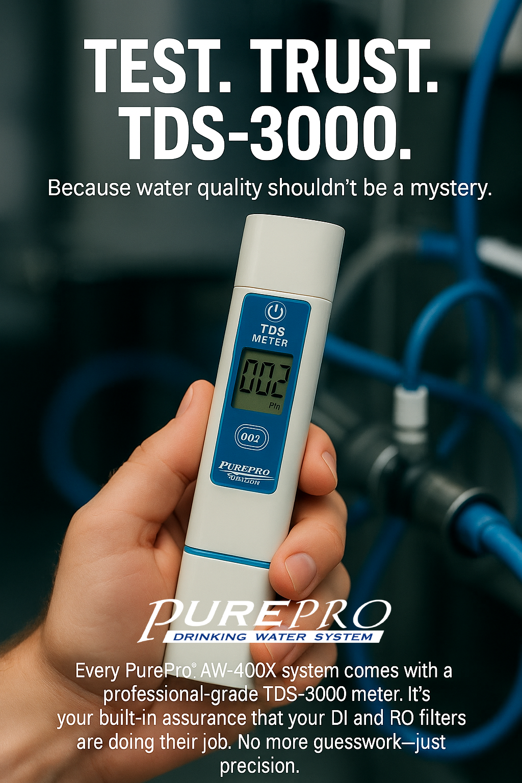 At PurePro®, we believe in transparency — not just in water clarity, but in water quality. That’s why every PurePro® AW-400X Ultra-Pure RO+DI System comes with a professional-grade TDS-3000 digital meter. It’s not just an accessory. It’s your front-line water verification tool — simple, powerful, and essential for daily confidence.